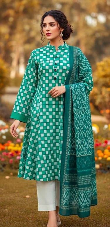 An elegant A-line kurti in refreshing green checks creates a graceful silhouette, paired beautifully with white trousers for a clean, summer-ready ethnic look. The outfit is complemented by a flowy hairstyle with a soft bun, adding effortless charm and sophistication—perfect for a comfortable yet stylish daytime ensemble.