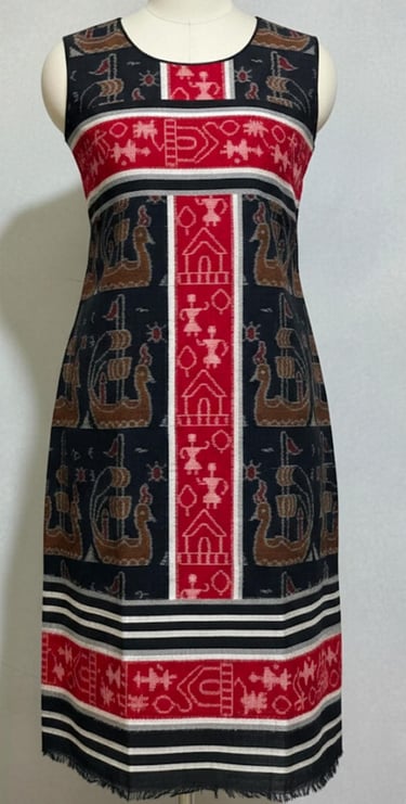 A stylish sleeveless Boita Bandana–inspired ethnic kurti showcases the rich heritage of Sambalpuri handloom with striking red and black colour hues. Its breathable fabric and sleeveless silhouette make it an ideal choice for comfortable summer nights, blending traditional motifs with a bold, contemporary ethnic style.